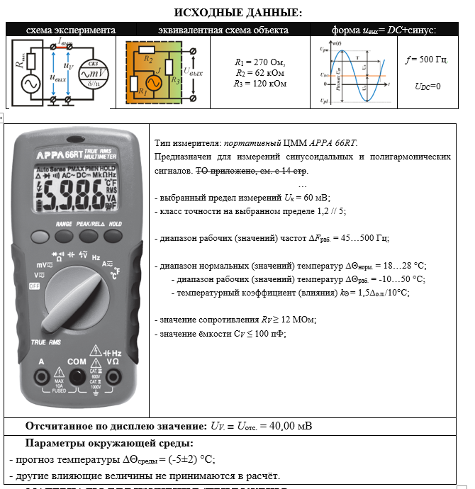 ИСХОДНЫЕ ДАННЫЕ: схема экспериментаэквивалентная схема объектаформа uвых= DC+синус: R1 = 270 Ом, R2 = 62 кОм R3 = 120 кОм f = 500 Гц. UDC=0 Тип измерителя: портативный ЦММ APPA 66RT. Предназначен для измерений синусоидальных и полигармонических сигналов. ТО приложено, см. с 14 стр. … - выбранный предел измерений Uк = 60 мВ; - класс точности на выбранном пределе 1,2 // 5; - диапазон рабочих (значений) частот ∆Fраб. = 45…500 Гц; - диапазон нормальных (значений) температур ∆Θнорм. = 18…28 °С; - диапазон рабочих (значений) температур ∆Θраб. = -10…50 °С; - температурный коэффициент (влияния) kΘ = 1,5∆о.п./10°С; - значение сопротивления RV ≥ 12 МОм; - значение ёмкости СV ≤ 100 пФ; Отсчитанное по дисплею значение: UV.