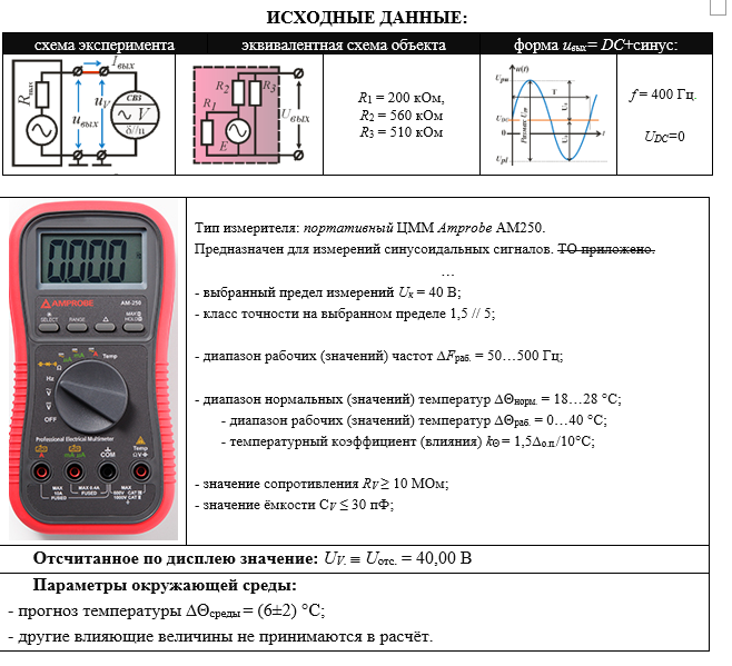ИСХОДНЫЕ ДАННЫЕ: схема экспериментаэквивалентная схема объектаформа uвых= DC+синус: R1 = 200 кОм, R2 = 560 кОм R3 = 510 кОм f = 400 Гц. UDC=0 Тип измерителя: портативный ЦММ Amprobe AM250. Предназначен для измерений синусоидальных сигналов. ТО приложено. … - выбранный предел измерений Uк = 40 В; - класс точности на выбранном пределе 1,5 // 5; - диапазон рабочих (значений) частот ∆Fраб. = 50…500 Гц; - диапазон нормальных (значений) температур ∆Θнорм. = 18…28 °С; - диапазон рабочих (значений) температур ∆Θраб. = 0…40 °С; - температурный коэффициент (влияния) kΘ = 1,5∆о.п./10°С; - значение сопротивления RV ≥ 10 МОм; - значение ёмкости СV ≤ 30 пФ; Отсчитанное по дисплею значение: UV.