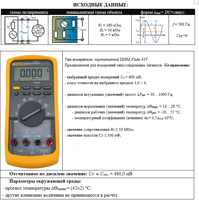 ИСХОДНЫЕ ДАННЫЕ: схема экспериментаэквивалентная схема объектаформа uвых= DC+синус: R1 = 360 кОм, R2 = 30 кОм R3 = 1 кОм f = 500 Гц. UDC=0 Тип измерителя: портативный ЦММ Fluke 83V. Предназначен для измерений синусоидальных сигналов. ТО приложено … - выбранный предел измерений Uк = 600 мВ; - класс точности на выбранном пределе 1,0 // 4; - диапазон актуальных (значений) частот ∆Fакт. = 30…1000 Гц; - диапазон нормальных (значений) температур ∆Θнорм. = 18…28 °С; - диапазон рабочих (значений) температур ∆Θраб. = -20…55 °С; - температурный коэффициент (влияния) kΘ = 0,5∆о.п./10°С; - значение сопротивления RV ≥ 10 МОм; - значение ёмкости СV ≤ 100 пФ; Отсчитанное по дисплею значение: UV.