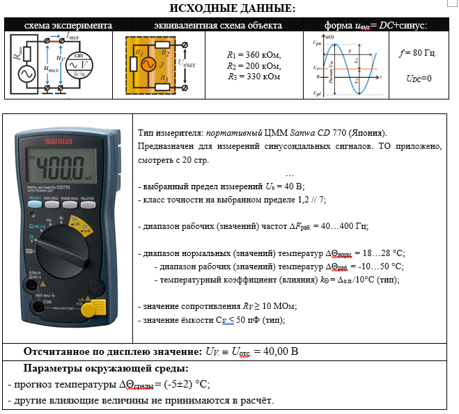 ИСХОДНЫЕ ДАННЫЕ: схема экспериментаэквивалентная схема объектаформа uвых= DC+синус: R1 = 360 кОм, R2 = 200 кОм, R3 = 330 кОм f = 80 Гц. UDC=0 Тип измерителя: портативный ЦММ Sanwa CD 770 (Япония). Предназначен для измерений синусоидальных сигналов. ТО приложено, смотреть с 20 стр. … - выбранный предел измерений Uк = 40 В; - класс точности на выбранном пределе 1,2 // 7; - диапазон рабочих (значений) частот ∆Fраб. = 40…400 Гц; - диапазон нормальных (значений) температур ∆Θнорм. = 18…28 °С; - диапазон рабочих (значений) температур ∆Θраб. = -10…50 °С; - температурный коэффициент (влияния) kΘ = ∆о.п./10°С (тип); - значение сопротивления RV ≥ 10 МОм; - значение ёмкости СV ≤ 50 пФ (тип); Отсчитанное по дисплею значение: UV.