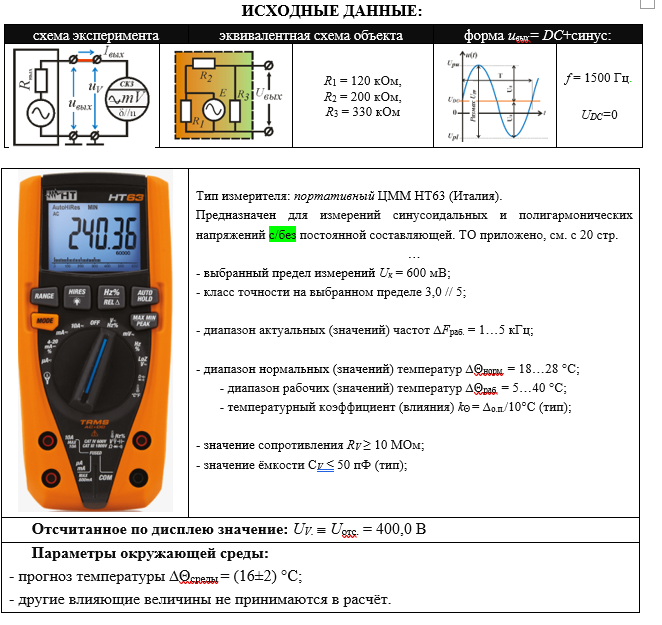 ИСХОДНЫЕ ДАННЫЕ: схема экспериментаэквивалентная схема объектаформа uвых= DC+синус: R1 = 120 кОм, R2 = 200 кОм, R3 = 330 кОм f = 1500 Гц. UDC=0 Тип измерителя: портативный ЦММ HT63 (Италия). Предназначен для измерений синусоидальных и полигармонических напряжений c/без постоянной составляющей. ТО приложено, см. с 20 стр. … - выбранный предел измерений Uк = 600 мВ; - класс точности на выбранном пределе 3,0 // 5; - диапазон актуальных (значений) частот ∆Fраб. = 1…5 кГц; - диапазон нормальных (значений) температур ∆Θнорм. = 18…28 °С; - диапазон рабочих (значений) температур ∆Θраб. = 5…40 °С; - температурный коэффициент (влияния) kΘ = ∆о.п./10°С (тип); - значение сопротивления RV ≥ 10 МОм; - значение ёмкости СV ≤ 50 пФ (тип); Отсчитанное по дисплею значение: UV.