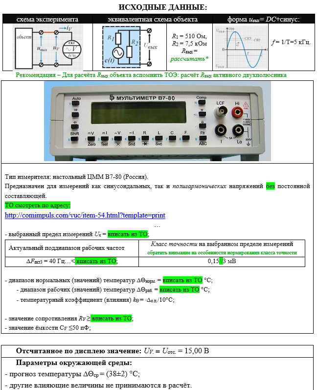 ИСХОДНЫЕ ДАННЫЕ: схема экспериментаэквивалентная схема объектаформа uвых= DC+синус: R1 = 510 Ом, R2 = 7,5 кОм Rвых = рассчитать* f = 1/Т=5 кГц. Рекомендация – Для расчёта Rвых объекта вспомнить ТОЭ: расчёт Rвых активного двухполюсника Тип измерителя: настольный ЦММ В7-80 (Россия). Предназначен для измерений как синусоидальных, так и полигармонических напряжений без постоянной составляющей. ТО смотреть по адресу: http://comimpuls.com/vuc/item-54.html?template=print … - выбранный предел измерений Uк = вписать из ТО; Актуальный поддиапазон рабочих частотКласс точности на выбранном пределе измерений обратить внимание на особенности нормирования класса точности ∆Fакт3 = 40 Гц…< вписать из ТО;0,15//3 мВ - диапазон нормальных (значений) температур ∆Θнорм.