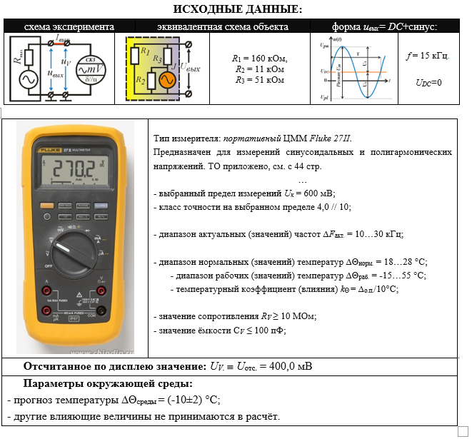 ИСХОДНЫЕ ДАННЫЕ: схема экспериментаэквивалентная схема объектаформа uвых= DC+синус: R1 = 160 кОм, R2 = 11 кОм R3 = 51 кОм f = 15 кГц. UDC=0 Тип измерителя: портативный ЦММ Fluke 27II. Предназначен для измерений синусоидальных и полигармонических напряжений. ТО приложено, см. с 44 стр. … - выбранный предел измерений Uк = 600 мВ; - класс точности на выбранном пределе 4,0 // 10; - диапазон актуальных (значений) частот ∆Fакт. = 10…30 кГц; - диапазон нормальных (значений) температур ∆Θнорм. = 18…28 °С; - диапазон рабочих (значений) температур ∆Θраб. = -15…55 °С; - температурный коэффициент (влияния) kΘ = ∆о.п./10°С; - значение сопротивления RV ≥ 10 МОм; - значение ёмкости СV ≤ 100 пФ; Отсчитанное по дисплею значение: UV.