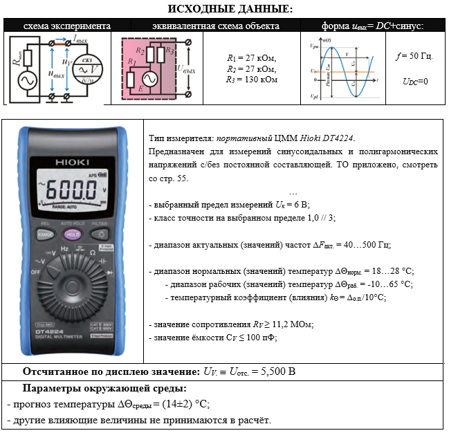ИСХОДНЫЕ ДАННЫЕ: схема экспериментаэквивалентная схема объектаформа uвых= DC+синус: R1 = 27 кОм, R2 = 27 кОм, R3 = 130 кОм f = 50 Гц. UDC=0 Тип измерителя: портативный ЦММ Hioki DT4224. Предназначен для измерений синусоидальных и полигармонических напряжений с/без постоянной составляющей. ТО приложено, смотреть со стр. 55. … - выбранный предел измерений Uк = 6 В; - класс точности на выбранном пределе 1,0 // 3; - диапазон актуальных (значений) частот ∆Fакт. = 40…500 Гц; - диапазон нормальных (значений) температур ∆Θнорм. = 18…28 °С; - диапазон рабочих (значений) температур ∆Θраб. = -10…65 °С; - температурный коэффициент (влияния) kΘ = ∆о.п./10°С; - значение сопротивления RV ≥ 11,2 МОм; - значение ёмкости СV ≤ 100 пФ; Отсчитанное по дисплею значение: UV.