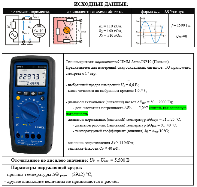 ИСХОДНЫЕ ДАННЫЕ: схема экспериментаэквивалентная схема объектаформа uвых= DC+синус: R1 = 110 кОм, R2 = 160 кОм, R3 = 510 кОм f = 1500 Гц. UDC=0 Тип измерителя: портативный ЦММ Lumel NP10 (Польша). Предназначен для измерений синусоидальных сигналов. ТО приложено, смотреть с 17 стр. … - выбранный предел измерений Uк = 6,6 В; - класс точности на выбранном пределе 1,0 // 3; - диапазон актуальных (значений) частот ∆Fакт. = 50…2000 Гц; - доп. частотная погрешность ∆Ff.п 5,0//7 считать как основную погрешность - диапазон нормальных (значений) температур ∆Θнорм. = 21…25 °С; - диапазон рабочих (значений) температур ∆Θраб. = 0…40 °С; - температурный коэффициент (влияния) kΘ = ∆о.п./10°С; - значение сопротивления RV ≥ 11 МОм; - значение ёмкости СV ≤ 40 пФ; Отсчитанное по дисплею значение: UV.