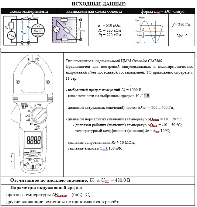 ИСХОДНЫЕ ДАННЫЕ: схема экспериментаэквивалентная схема объектаформа uвых= DC+синус: R1 = 510 кОм, R2 = 330 кОм R3 = 270 кОм f = 250 Гц. UDC=0 Тип измерителя: портативный ЦММ Greenlee CM1560. Предназначен для измерений синусоидальных и полигармонических напряжений с/без постоянной составляющей. ТО приложено, смотреть с 11 стр. … - выбранный предел измерений Uк = 1000 В; - класс точности на выбранном пределе 10 // 5 В; - диапазон актуальных (значений) частот ∆Fакт. = 200…400 Гц; - диапазон нормальных (значений) температур ∆Θнорм. = 18…28 °С; - диапазон рабочих (значений) температур ∆Θраб. = -10…50 °С; - температурный коэффициент (влияния) kΘ = ∆о.п./10°С; - значение сопротивления RV ≥ 10 МОм; - значение ёмкости СV ≤ 100 пФ; Отсчитанное по дисплею значение: UV.