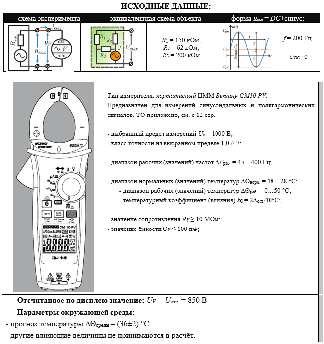 ИСХОДНЫЕ ДАННЫЕ: схема экспериментаэквивалентная схема объектаформа uвых= DC+синус: R1 = 150 кОм, R2 = 62 кОм, R3 = 200 кОм f = 200 Гц. UDC=0 Тип измерителя: портативный ЦММ Benning CM10 PV. Предназначен для измерений синусоидальных и полигармонических сигналов. ТО приложено, см. с 12 стр. … - выбранный предел измерений Uк = 1000 В; - класс точности на выбранном пределе 1,0 // 7; - диапазон рабочих (значений) частот ∆Fраб. = 45…400 Гц; - диапазон нормальных (значений) температур ∆Θнорм. = 18…28 °С; - диапазон рабочих (значений) температур ∆Θраб. = 0…50 °С; - температурный коэффициент (влияния) kΘ = 2∆о.п./10°С; - значение сопротивления RV ≥ 10 МОм; - значение ёмкости СV ≤ 100 пФ; Отсчитанное по дисплею значение: UV.