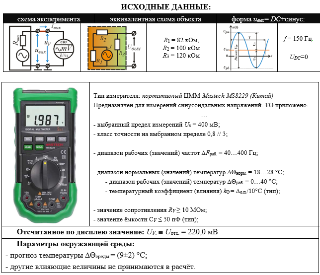 ИСХОДНЫЕ ДАННЫЕ: схема экспериментаэквивалентная схема объектаформа uвых= DC+синус: R1 = 82 кОм, R2 = 100 кОм R3 = 120 кОм f = 150 Гц. UDC=0 Тип измерителя: портативный ЦММ Mastech MS8229 (Китай) Предназначен для измерений синусоидальных напряжений. ТО приложено. … - выбранный предел измерений Uк = 400 мВ; - класс точности на выбранном пределе 0,8 // 3; - диапазон рабочих (значений) частот ∆Fраб. = 40…400 Гц; - диапазон нормальных (значений) температур ∆Θнорм. = 18…28 °С; - диапазон рабочих (значений) температур ∆Θраб. = 0…40 °С; - температурный коэффициент (влияния) kΘ = ∆о.п./10°С (тип); - значение сопротивления RV ≥ 10 МОм; - значение ёмкости СV ≤ 50 пФ (тип); Отсчитанное по дисплею значение: UV.