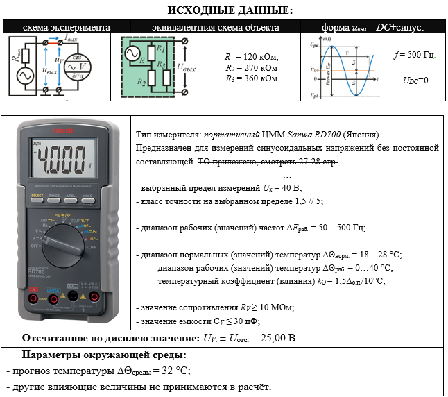 ИСХОДНЫЕ ДАННЫЕ: схема экспериментаэквивалентная схема объектаформа uвых= DC+синус: R1 = 120 кОм, R2 = 270 кОм R3 = 360 кОм f = 500 Гц. UDC=0 Тип измерителя: портативный ЦММ Sanwa RD700 (Япония). Предназначен для измерений синусоидальных напряжений без постоянной составляющей. ТО приложено, смотреть 27-28 стр. … - выбранный предел измерений Uк = 40 В; - класс точности на выбранном пределе 1,5 // 5; - диапазон рабочих (значений) частот ∆Fраб. = 50…500 Гц; - диапазон нормальных (значений) температур ∆Θнорм. = 18…28 °С; - диапазон рабочих (значений) температур ∆Θраб. = 0…40 °С; - температурный коэффициент (влияния) kΘ = 1,5∆о.п./10°С; - значение сопротивления RV ≥ 10 МОм; - значение ёмкости СV ≤ 30 пФ; Отсчитанное по дисплею значение: UV.