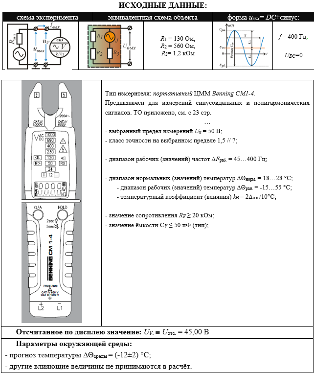 ИСХОДНЫЕ ДАННЫЕ: схема экспериментаэквивалентная схема объектаформа uвых= DC+синус: R1 = 130 Ом, R2 = 560 Ом, R3= 1,2 кОм f = 400 Гц. UDC=0 Тип измерителя: портативный ЦММ Benning CM1-4. Предназначен для измерений синусоидальных и полигармонических сигналов. ТО приложено, см. с 23 стр. … - выбранный предел измерений Uк = 50 В; - класс точности на выбранном пределе 1,5 // 7; - диапазон рабочих (значений) частот ∆Fраб. = 45…400 Гц; - диапазон нормальных (значений) температур ∆Θнорм. = 18…28 °С; - диапазон рабочих (значений) температур ∆Θраб. = -15…55 °С; - температурный коэффициент (влияния) kΘ = 2∆о.п./10°С; - значение сопротивления RV ≥ 20 кОм; - значение ёмкости СV ≤ 50 пФ (тип); Отсчитанное по дисплею значение: UV.