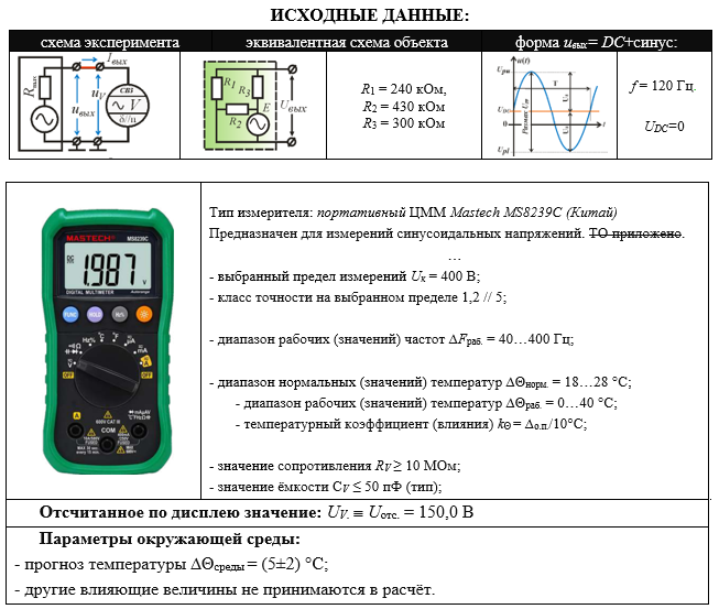 ИСХОДНЫЕ ДАННЫЕ: схема экспериментаэквивалентная схема объектаформа uвых= DC+синус: R1 = 240 кОм, R2 = 430 кОм R3 = 300 кОм f = 120 Гц. UDC=0 Тип измерителя: портативный ЦММ Mastech MS8239C (Китай) Предназначен для измерений синусоидальных напряжений. ТО приложено. … - выбранный предел измерений Uк = 400 В; - класс точности на выбранном пределе 1,2 // 5; - диапазон рабочих (значений) частот ∆Fраб. = 40…400 Гц; - диапазон нормальных (значений) температур ∆Θнорм. = 18…28 °С; - диапазон рабочих (значений) температур ∆Θраб. = 0…40 °С; - температурный коэффициент (влияния) kΘ = ∆о.п./10°С; - значение сопротивления RV ≥ 10 МОм; - значение ёмкости СV ≤ 50 пФ (тип); Отсчитанное по дисплею значение: UV.