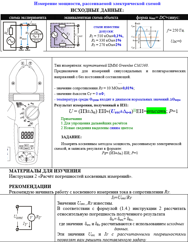 Измерение мощности, рассеиваемой электрической схемой ИСХОДНЫЕ ДАННЫЕ: схема экспериментаэквивалентная схема объектаформа uвых= DC+синус: стали известны допуски: R1 = 510 кОм±0,1%, R2 = 330 кОм±1% R3 = 270 кОм±2% f = 250 Гц. UDC=0 Тип измерителя: портативный ЦММ Greenlee CM1560. Предназначен для измерений синусоидальных и полигармонических напряжений с/без постоянной составляющей. … - значение сопротивления RV = 10 МОм±0,01%; - значение ёмкости СV = 0 пФ; - температура среды Θсреды входит в диапазон нормальных значений ∆Θнорм Результат измерения, полученный в ИЗ1: U = (ИЗ±∆п) ЕИ(Uотс±∆о.п)1)ЕИ=вписать; Р=1 Примечания 1 Для упрощения дальнейших расчётов 2 Новые сведения выделены синим цветом ЗАДАНИЕ: Измерить косвенным методом мощность, рассеиваемую электрической схемой, и записать результат в формате: РЕ= (ИЗ±∆п.) ЕИ; Р=1 МАТЕРИАЛЫ ДЛЯ ИЗУЧЕНИЯ Инструкция 2 «Расчёт погрешностей косвенных измерений».