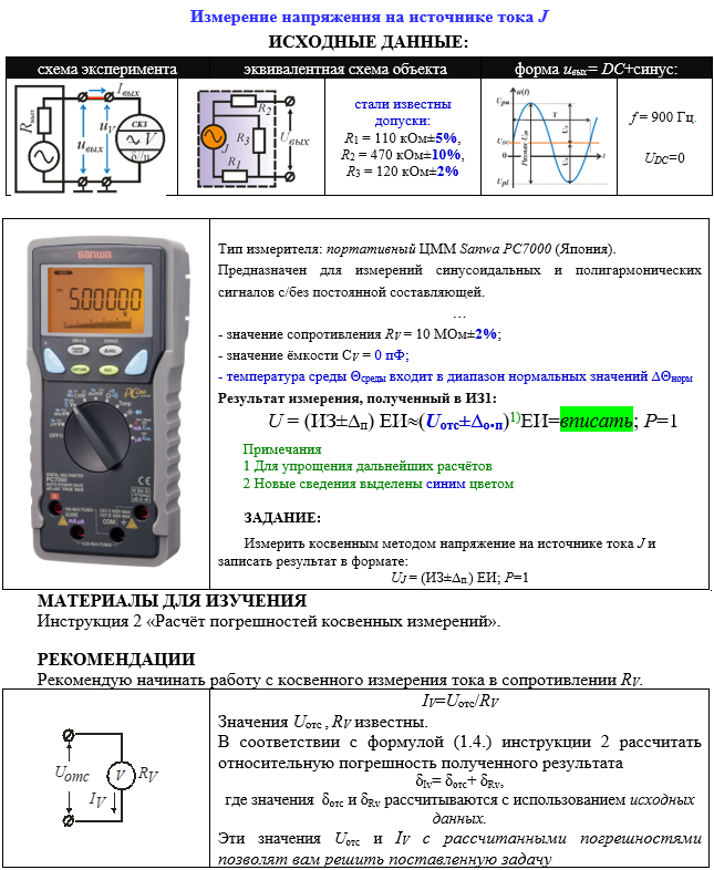 Измерение напряжения на источнике тока J ИСХОДНЫЕ ДАННЫЕ: схема экспериментаэквивалентная схема объектаформа uвых= DC+синус: стали известны допуски: R1 = 110 кОм±5%, R2 = 470 кОм±10%, R3 = 120 кОм±2% f = 900 Гц. UDC=0 Тип измерителя: портативный ЦММ Sanwa PC7000 (Япония). Предназначен для измерений синусоидальных и полигармонических сигналов c/без постоянной составляющей. … - значение сопротивления RV = 10 МОм±2%; - значение ёмкости СV = 0 пФ; - температура среды Θсреды входит в диапазон нормальных значений ∆Θнорм Результат измерения, полученный в ИЗ1: U = (ИЗ±∆п) ЕИ(Uотс±∆о.п)1)ЕИ=вписать; Р=1 Примечания 1 Для упрощения дальнейших расчётов 2 Новые сведения выделены синим цветом ЗАДАНИЕ: Измерить косвенным методом напряжение на источнике тока J и записать результат в формате: UJ = (ИЗ±∆п.) ЕИ; Р=1 МАТЕРИАЛЫ ДЛЯ ИЗУЧЕНИЯ Инструкция 2 «Расчёт погрешностей косвенных измерений».
