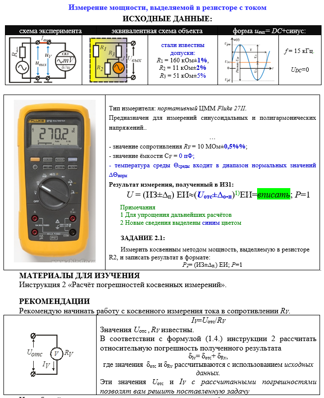 Измерение мощности, выделяемой в резисторе с током ИСХОДНЫЕ ДАННЫЕ: схема экспериментаэквивалентная схема объектаформа uвых= DC+синус: стали известны допуски: R1 = 160 кОм±1%, R2 = 11 кОм±2% R3 = 51 кОм±5% f = 15 кГц. UDC=0 Тип измерителя: портативный ЦММ Fluke 27II. Предназначен для измерений синусоидальных и полигармонических напряжений.. … - значение сопротивления RV = 10 МОм±0,5%%; - значение ёмкости СV = 0 пФ; - температура среды Θсреды входит в диапазон нормальных значений ∆Θнорм Результат измерения, полученный в ИЗ1: U = (ИЗ±∆п) ЕИ(Uотс±∆о.п)1)ЕИ=вписать; Р=1 Примечания 1 Для упрощения дальнейших расчётов 2 Новые сведения выделены синим цветом ЗАДАНИЕ 2.1: Измерить косвенным методом мощность, выделяемую в резисторе R2, и записать результат в формате: Р2= (ИЗ±∆п.) ЕИ; Р=1 МАТЕРИАЛЫ ДЛЯ ИЗУЧЕНИЯ Инструкция 2 «Расчёт погрешностей косвенных измерений».