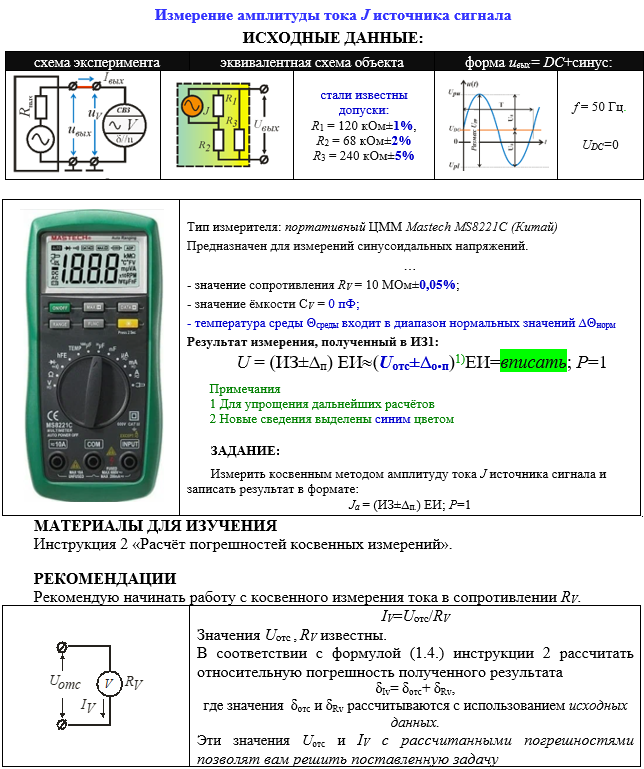 Измерение амплитуды тока J источника сигнала ИСХОДНЫЕ ДАННЫЕ: схема экспериментаэквивалентная схема объектаформа uвых= DC+синус: стали известны допуски: R1 = 120 кОм±1%, R2 = 68 кОм±2% R3 = 240 кОм±5% f = 50 Гц. UDC=0 Тип измерителя: портативный ЦММ Mastech MS8221C (Китай) Предназначен для измерений синусоидальных напряжений. … - значение сопротивления RV = 10 МОм±0,05%; - значение ёмкости СV = 0 пФ; - температура среды Θсреды входит в диапазон нормальных значений ∆Θнорм Результат измерения, полученный в ИЗ1: U = (ИЗ±∆п) ЕИ(Uотс±∆о.п)1)ЕИ=вписать; Р=1 Примечания 1 Для упрощения дальнейших расчётов 2 Новые сведения выделены синим цветом ЗАДАНИЕ: Измерить косвенным методом амплитуду тока J источника сигнала и записать результат в формате: Jа = (ИЗ±∆п.) ЕИ; Р=1 МАТЕРИАЛЫ ДЛЯ ИЗУЧЕНИЯ Инструкция 2 «Расчёт погрешностей косвенных измерений».