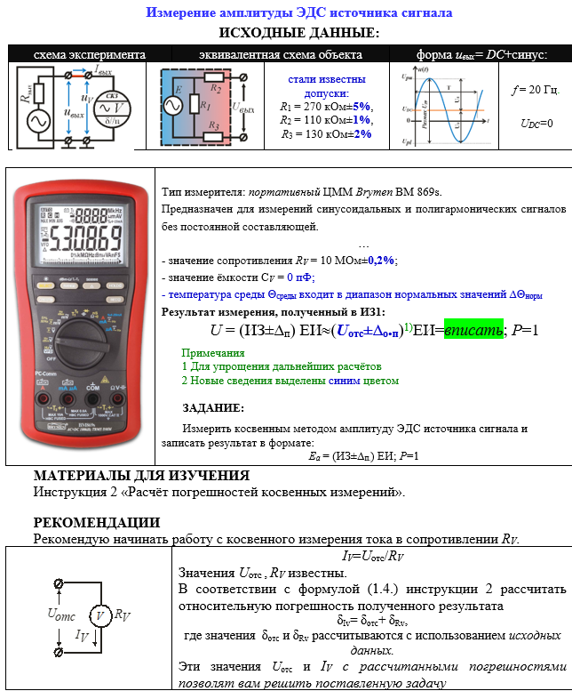 Измерение амплитуды ЭДС источника сигнала ИСХОДНЫЕ ДАННЫЕ: схема экспериментаэквивалентная схема объектаформа uвых= DC+синус: стали известны допуски: R1 = 270 кОм±5%, R2 = 110 кОм±1%, R3 = 130 кОм±2% f = 20 Гц. UDC=0 Тип измерителя: портативный ЦММ Brymen BM 869s. Предназначен для измерений синусоидальных и полигармонических сигналов без постоянной составляющей. … - значение сопротивления RV = 10 МОм±0,2%; - значение ёмкости СV = 0 пФ; - температура среды Θсреды входит в диапазон нормальных значений ∆Θнорм Результат измерения, полученный в ИЗ1: U = (ИЗ±∆п) ЕИ(Uотс±∆о.п)1)ЕИ=вписать; Р=1 Примечания 1 Для упрощения дальнейших расчётов 2 Новые сведения выделены синим цветом ЗАДАНИЕ: Измерить косвенным методом амплитуду ЭДС источника сигнала и записать результат в формате: Еа = (ИЗ±∆п.) ЕИ; Р=1 МАТЕРИАЛЫ ДЛЯ ИЗУЧЕНИЯ Инструкция 2 «Расчёт погрешностей косвенных измерений».
