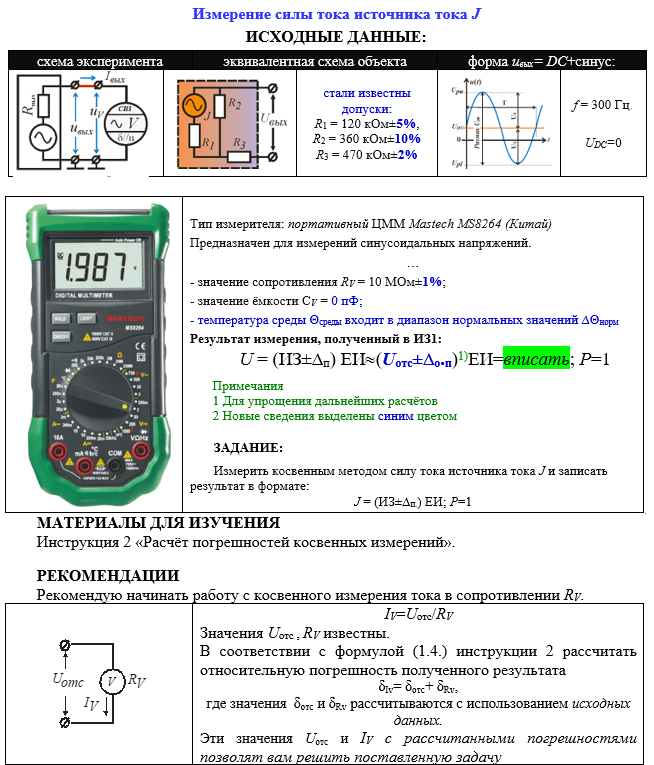 Измерение силы тока источника тока J ИСХОДНЫЕ ДАННЫЕ: схема экспериментаэквивалентная схема объектаформа uвых= DC+синус: стали известны допуски: R1 = 120 кОм±5%, R2 = 360 кОм±10% R3 = 470 кОм±2% f = 300 Гц. UDC=0 Тип измерителя: портативный ЦММ Mastech MS8264 (Китай) Предназначен для измерений синусоидальных напряжений. … - значение сопротивления RV = 10 МОм±1%; - значение ёмкости СV = 0 пФ; - температура среды Θсреды входит в диапазон нормальных значений ∆Θнорм Результат измерения, полученный в ИЗ1: U = (ИЗ±∆п) ЕИ(Uотс±∆о.п)1)ЕИ=вписать; Р=1 Примечания 1 Для упрощения дальнейших расчётов 2 Новые сведения выделены синим цветом ЗАДАНИЕ: Измерить косвенным методом силу тока источника тока J и записать результат в формате: J = (ИЗ±∆п.) ЕИ; Р=1 МАТЕРИАЛЫ ДЛЯ ИЗУЧЕНИЯ Инструкция 2 «Расчёт погрешностей косвенных измерений».