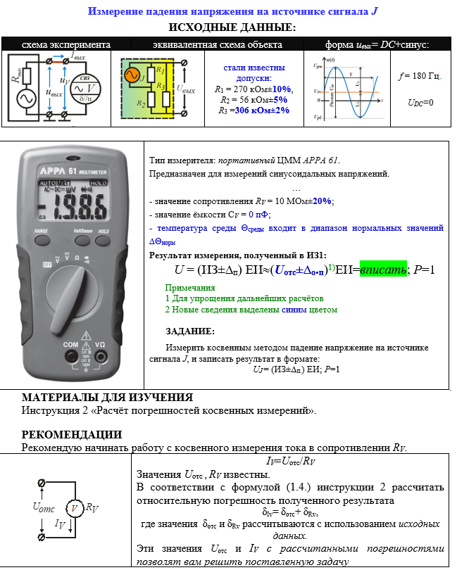 Измерение падения напряжения на источнике сигнала J ИСХОДНЫЕ ДАННЫЕ: схема экспериментаэквивалентная схема объектаформа uвых= DC+синус: стали известны допуски: R1 = 270 кОм±10%, R2 = 56 кОм±5% R3 =306 кОм±2% f = 180 Гц. UDC=0 Тип измерителя: портативный ЦММ APPA 61. Предназначен для измерений синусоидальных напряжений. … - значение сопротивления RV = 10 МОм±20%; - значение ёмкости СV = 0 пФ; - температура среды Θсреды входит в диапазон нормальных значений ∆Θнорм Результат измерения, полученный в ИЗ1: U = (ИЗ±∆п) ЕИ(Uотс±∆о.п)1)ЕИ=вписать; Р=1 Примечания 1 Для упрощения дальнейших расчётов 2 Новые сведения выделены синим цветом ЗАДАНИЕ: Измерить косвенным методом падение напряжение на источнике сигнала J, и записать результат в формате: UJ = (ИЗ±∆п.) ЕИ; Р=1 МАТЕРИАЛЫ ДЛЯ ИЗУЧЕНИЯ Инструкция 2 «Расчёт погрешностей косвенных измерений».