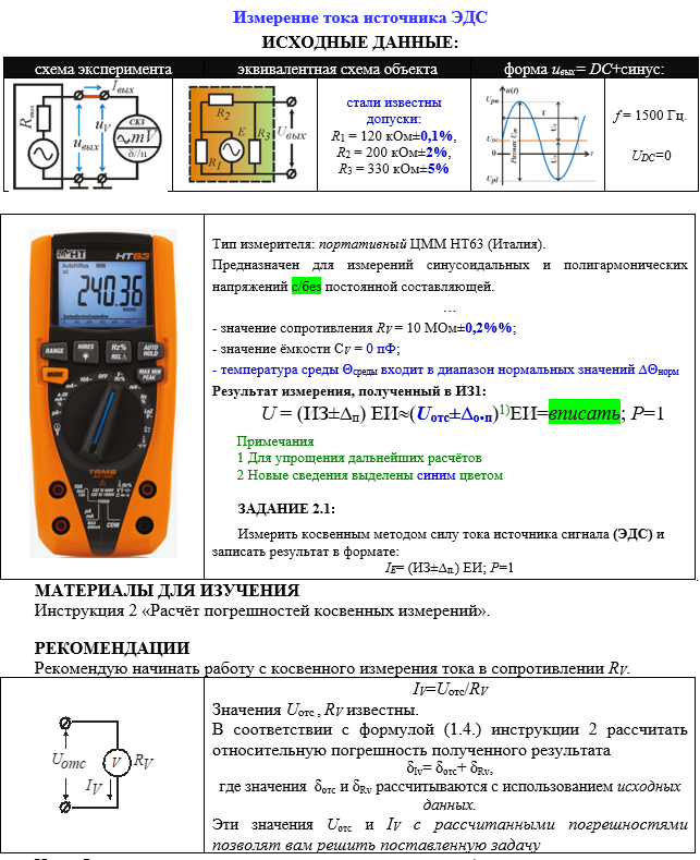 Измерение силы ЭДС источника сигнала ИСХОДНЫЕ ДАННЫЕ: схема экспериментаэквивалентная схема объектаформа uвых= DC+синус: стали известны допуски: R1 = 91 кОм±1%, R2 = 18 кОм±5% R3 = 300 кОм±2% f = 200 Гц. UDC=0 Тип измерителя: портативный ЦММ Amprobe ACD-14 Plus. Предназначен для измерений синусоидальных сигналов. … - значение сопротивления RV = 10 МОм±1%; - значение ёмкости СV = 0 пФ; - температура среды Θсреды входит в диапазон нормальных значений ∆Θнорм Результат измерения, полученный в ИЗ1: U = (ИЗ±∆п) ЕИ(Uотс±∆о.п)1)ЕИ=вписать; Р=1 Примечания 1 Для упрощения дальнейших расчётов 2 Новые сведения выделены синим цветом ЗАДАНИЕ: Измерить косвенным методом ЭДС источника сигнала и записать результат в формате: Е= (ИЗ±∆п.) ЕИ; Р=1 МАТЕРИАЛЫ ДЛЯ ИЗУЧЕНИЯ Инструкция 2 «Расчёт погрешностей косвенных измерений».