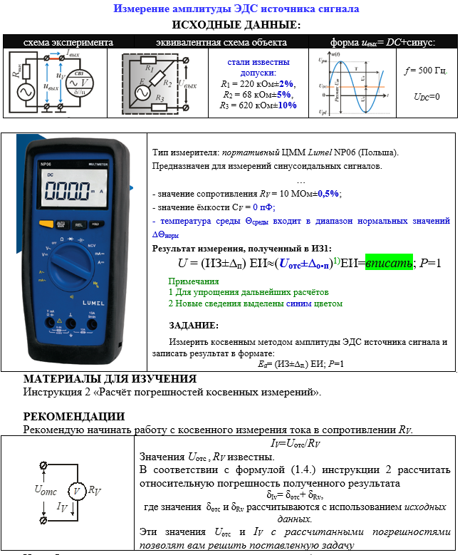Измерение амплитуды ЭДС источника сигнала ИСХОДНЫЕ ДАННЫЕ: схема экспериментаэквивалентная схема объектаформа uвых= DC+синус: стали известны допуски: R1 = 220 кОм±2%, R2 = 68 кОм±5%, R3 = 620 кОм±10% f = 500 Гц. UDC=0 Тип измерителя: портативный ЦММ Lumel NP06 (Польша). Предназначен для измерений синусоидальных сигналов. … - значение сопротивления RV = 10 МОм±0,5%; - значение ёмкости СV = 0 пФ; - температура среды Θсреды входит в диапазон нормальных значений ∆Θнорм Результат измерения, полученный в ИЗ1: U = (ИЗ±∆п) ЕИ(Uотс±∆о.п)1)ЕИ=вписать; Р=1 Примечания 1 Для упрощения дальнейших расчётов 2 Новые сведения выделены синим цветом ЗАДАНИЕ: Измерить косвенным методом амплитуды ЭДС источника сигнала и записать результат в формате: Еа= (ИЗ±∆п.) ЕИ; Р=1 МАТЕРИАЛЫ ДЛЯ ИЗУЧЕНИЯ Инструкция 2 «Расчёт погрешностей косвенных измерений».
