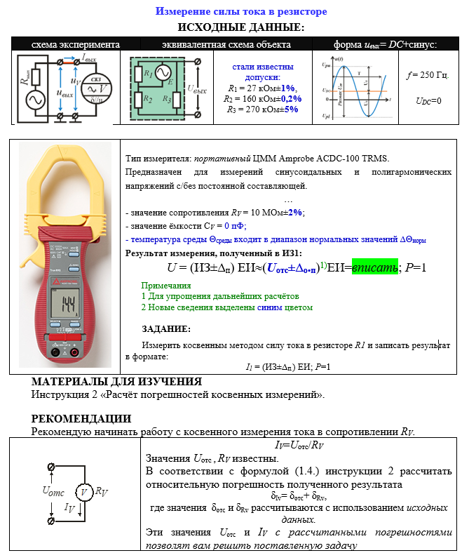 Измерение силы тока в резисторе ИСХОДНЫЕ ДАННЫЕ: схема экспериментаэквивалентная схема объектаформа uвых= DC+синус: стали известны допуски: R1 = 27 кОм±1%, R2 = 160 кОм±0,2% R3 = 270 кОм±5% f = 250 Гц. UDC=0 Тип измерителя: портативный ЦММ Amprobe ACDC-100 TRMS. Предназначен для измерений синусоидальных и полигармонических напряжений с/без постоянной составляющей. … - значение сопротивления RV = 10 МОм±2%; - значение ёмкости СV = 0 пФ; - температура среды Θсреды входит в диапазон нормальных значений ∆Θнорм Результат измерения, полученный в ИЗ1: U = (ИЗ±∆п) ЕИ(Uотс±∆о.п)1)ЕИ=вписать; Р=1 Примечания 1 Для упрощения дальнейших расчётов 2 Новые сведения выделены синим цветом ЗАДАНИЕ: Измерить косвенным методом силу тока в резисторе R1 и записать результат в формате: I1 = (ИЗ±∆п.) ЕИ; Р=1 МАТЕРИАЛЫ ДЛЯ ИЗУЧЕНИЯ Инструкция 2 «Расчёт погрешностей косвенных измерений».