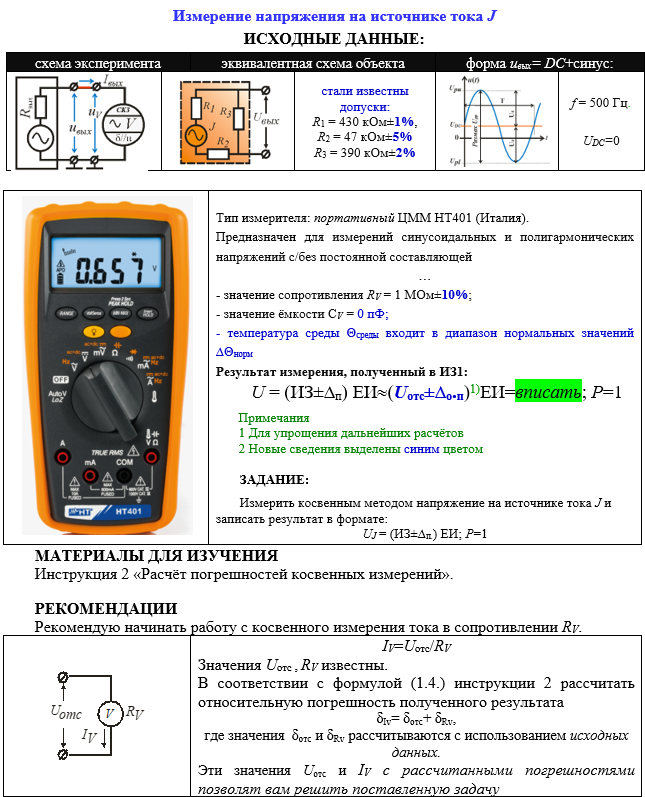 Измерение напряжения на источнике тока J ИСХОДНЫЕ ДАННЫЕ: схема экспериментаэквивалентная схема объектаформа uвых= DC+синус: стали известны допуски: R1 = 430 кОм±1%, R2 = 47 кОм±5% R3 = 390 кОм±2% f = 500 Гц. UDC=0 Тип измерителя: портативный ЦММ HT401 (Италия). Предназначен для измерений синусоидальных и полигармонических напряжений c/без постоянной составляющей … - значение сопротивления RV = 1 МОм±10%; - значение ёмкости СV = 0 пФ; - температура среды Θсреды входит в диапазон нормальных значений ∆Θнорм Результат измерения, полученный в ИЗ1: U = (ИЗ±∆п) ЕИ(Uотс±∆о.п)1)ЕИ=вписать; Р=1 Примечания 1 Для упрощения дальнейших расчётов 2 Новые сведения выделены синим цветом ЗАДАНИЕ: Измерить косвенным методом напряжение на источнике тока J и записать результат в формате: UJ = (ИЗ±∆п.) ЕИ; Р=1 МАТЕРИАЛЫ ДЛЯ ИЗУЧЕНИЯ Инструкция 2 «Расчёт погрешностей косвенных измерений».