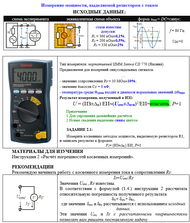 Измерение мощности, выделяемой резистором с током ИСХОДНЫЕ ДАННЫЕ: схема экспериментаэквивалентная схема объектаформа uвых= DC+синус: стали известны допуски: R1 = 360 кОм±0,1%, R2 = 200 кОм±0,5%, R3 = 330 кОм±2% f = 80 Гц. UDC=0 Тип измерителя: портативный ЦММ Sanwa CD 770 (Япония). Предназначен для измерений синусоидальных сигналов. … - значение сопротивления RV = 10 МОм±10%; - значение ёмкости СV = 0 пФ; - температура среды Θсреды входит в диапазон нормальных значений ∆Θнорм Результат измерения, полученный в ИЗ1: U = (ИЗ±∆п) ЕИ(Uотс±∆о.п)1)ЕИ=вписать; Р=1 Примечания 1 Для упрощения дальнейших расчётов 2 Новые сведения выделены синим цветом ЗАДАНИЕ 2.1: Измерить косвенным методом мощность, выделяемую резистором R1, и записать результат в формате: Р1= (ИЗ±∆п.) ЕИ; Р=1 МАТЕРИАЛЫ ДЛЯ ИЗУЧЕНИЯ Инструкция 2 «Расчёт погрешностей косвенных измерений».