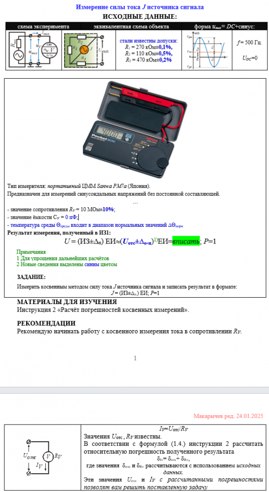 Измерение силы тока J источника сигнала ИСХОДНЫЕ ДАННЫЕ: схема экспериментаэквивалентная схема объектаформа uвых= DC+синус: стали известны допуски: R1 = 270 кОм±0,1%, R2 = 110 кОм±0,5%, R3 = 470 кОм±0,2% f = 500 Гц. UDC=0 Тип измерителя: портативный ЦММ Sanwa PM7a (Япония). Предназначен для измерений синусоидальных напряжений без постоянной составляющей. … - значение сопротивления RV = 10 МОм±10%; - значение ёмкости СV = 0 пФ; - температура среды Θсреды входит в диапазон нормальных значений ∆Θнорм Результат измерения, полученный в ИЗ1: U = (ИЗ±∆п) ЕИ(Uотс±∆о.п)1)ЕИ=вписать; Р=1 Примечания 1 Для упрощения дальнейших расчётов 2 Новые сведения выделены синим цветом ЗАДАНИЕ: Измерить косвенным методом силу тока J источника сигнала и записать результат в формате: J = (ИЗ±∆п.) ЕИ; Р=1 МАТЕРИАЛЫ ДЛЯ ИЗУЧЕНИЯ Инструкция 2 «Расчёт погрешностей косвенных измерений».