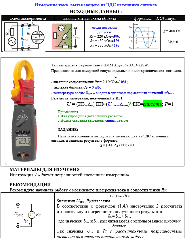 Измерение тока, вытекающего из ЭДС источника сигнала ИСХОДНЫЕ ДАННЫЕ: схема экспериментаэквивалентная схема объектаформа uвых= DC+синус: стали известны допуски: R1 = 220 кОм±5%, R2 = 430 кОм±1% R3 = 330 кОм±2% f = 400 Гц. UDC=0 Тип измерителя: портативный ЦММ Amprobe ACD-22SW. Предназначен для измерений синусоидальных и полигармонических сигналов. … - значение сопротивления RV = 9,1 МОм±10%; - значение ёмкости СV = 0 пФ; - температура среды Θсреды входит в диапазон нормальных значений ∆Θнорм Результат измерения, полученный в ИЗ1: U = (ИЗ±∆п) ЕИ(Uотс±∆о.п)1)ЕИ=вписать; Р=1 Примечания 1 Для упрощения дальнейших расчётов 2 Новые сведения выделены синим цветом ЗАДАНИЕ: Измерить косвенным методом ток, вытекающий из ЭДС источника сигнала, и записать результат в формате: IE = (ИЗ±∆п.) ЕИ; Р=1 МАТЕРИАЛЫ ДЛЯ ИЗУЧЕНИЯ Инструкция 2 «Расчёт погрешностей косвенных измерений».
