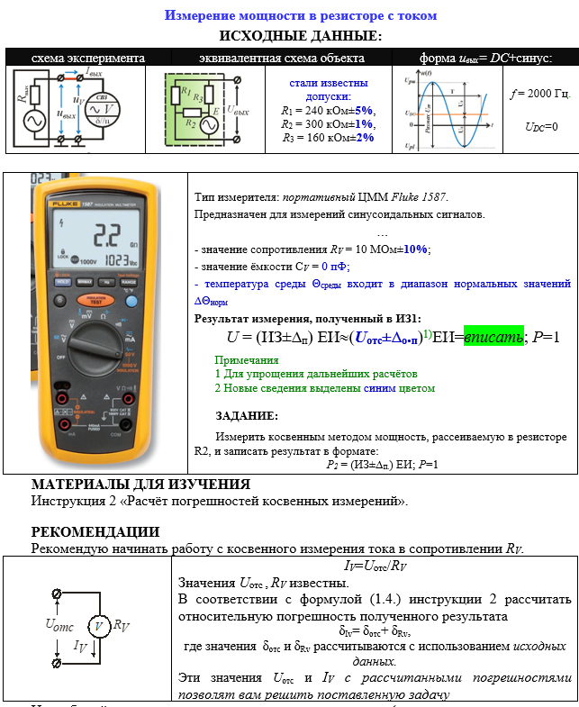 Измерение мощности в резисторе с током ИСХОДНЫЕ ДАННЫЕ: схема экспериментаэквивалентная схема объектаформа uвых= DC+синус: стали известны допуски: R1 = 240 кОм±5%, R2 = 300 кОм±1%, R3 = 160 кОм±2% f = 2000 Гц. UDC=0 Тип измерителя: портативный ЦММ Fluke 1587. Предназначен для измерений синусоидальных сигналов. … - значение сопротивления RV = 10 МОм±10%; - значение ёмкости СV = 0 пФ; - температура среды Θсреды входит в диапазон нормальных значений ∆Θнорм Результат измерения, полученный в ИЗ1: U = (ИЗ±∆п) ЕИ(Uотс±∆о.п)1)ЕИ=вписать; Р=1 Примечания 1 Для упрощения дальнейших расчётов 2 Новые сведения выделены синим цветом ЗАДАНИЕ: Измерить косвенным методом мощность, рассеиваемую в резисторе R2, и записать результат в формате: Р2 = (ИЗ±∆п.) ЕИ; Р=1 МАТЕРИАЛЫ ДЛЯ ИЗУЧЕНИЯ Инструкция 2 «Расчёт погрешностей косвенных измерений».