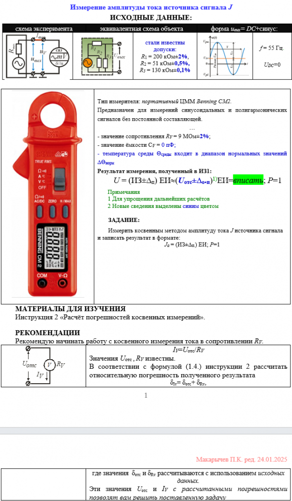 Измерение амплитуды тока источника сигнала J ИСХОДНЫЕ ДАННЫЕ: схема экспериментаэквивалентная схема объектаформа uвых= DC+синус: стали известны допуски: R1 = 200 кОм±2%, R2 = 51 кОм±0,5%, R3 = 130 кОм±0,1% f = 55 Гц. UDC=0 Тип измерителя: портативный ЦММ Benning CM2. Предназначен для измерений синусоидальных и полигармонических сигналов без постоянной составляющей. … - значение сопротивления RV = 9 МОм±2%; - значение ёмкости СV = 0 пФ; - температура среды Θсреды входит в диапазон нормальных значений ∆Θнорм Результат измерения, полученный в ИЗ1: U = (ИЗ±∆п) ЕИ(Uотс±∆о.п)1)ЕИ=вписать; Р=1 Примечания 1 Для упрощения дальнейших расчётов 2 Новые сведения выделены синим цветом ЗАДАНИЕ: Измерить косвенным методом амплитуду тока J источника сигнала и записать результат в формате: Jа = (ИЗ±∆п.) ЕИ; Р=1 МАТЕРИАЛЫ ДЛЯ ИЗУЧЕНИЯ Инструкция 2 «Расчёт погрешностей косвенных измерений».