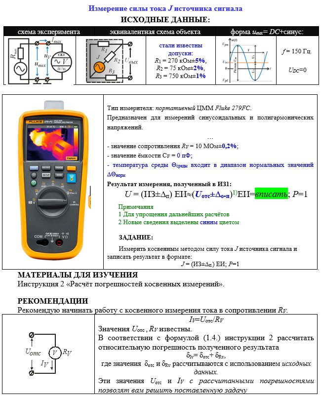 Измерение силы тока J источника сигнала ИСХОДНЫЕ ДАННЫЕ: схема экспериментаэквивалентная схема объектаформа uвых= DC+синус: стали известны допуски: R1 = 270 кОм±5%, R2 = 75 кОм±2%, R3 = 750 кОм±1% f = 150 Гц. UDC=0 Тип измерителя: портативный ЦММ Fluke 279FC. Предназначен для измерений синусоидальных и полигармонических напряжений. … - значение сопротивления RV = 10 МОм±0,2%; - значение ёмкости СV = 0 пФ; - температура среды Θсреды входит в диапазон нормальных значений ∆Θнорм Результат измерения, полученный в ИЗ1: U = (ИЗ±∆п) ЕИ(Uотс±∆о.п)1)ЕИ=вписать; Р=1 Примечания 1 Для упрощения дальнейших расчётов 2 Новые сведения выделены синим цветом ЗАДАНИЕ: Измерить косвенным методом силу тока J источника сигнала и записать результат в формате: J = (ИЗ±∆п.) ЕИ; Р=1 МАТЕРИАЛЫ ДЛЯ ИЗУЧЕНИЯ Инструкция 2 «Расчёт погрешностей косвенных измерений».