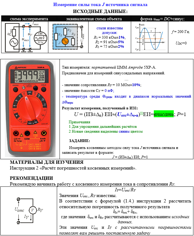 Измерение силы тока J источника сигнала ИСХОДНЫЕ ДАННЫЕ: схема экспериментаэквивалентная схема объектаформа uвых= DC+синус: стали известны допуски: R1 = 330 кОм±1%, R2 = 91 кОм±5% R3 = 75 кОм±2% f = 200 Гц. UDC=0 Тип измерителя: портативный ЦММ Amprobe 5XP-A. Предназначен для измерений синусоидальных напряжений. … - значение сопротивления RV = 10 МОм±10%; - значение ёмкости СV = 0 пФ; - температура среды Θсреды входит в диапазон нормальных значений ∆Θнорм Результат измерения, полученный в ИЗ1: U = (ИЗ±∆п) ЕИ(Uотс±∆о.п)1)ЕИ=вписать; Р=1 Примечания 1 Для упрощения дальнейших расчётов 2 Новые сведения выделены синим цветом ЗАДАНИЕ: Измерить косвенным методом силу тока J источника сигнала и записать результат в формате: J = (ИЗ±∆п.) ЕИ; Р=1 МАТЕРИАЛЫ ДЛЯ ИЗУЧЕНИЯ Инструкция 2 «Расчёт погрешностей косвенных измерений».