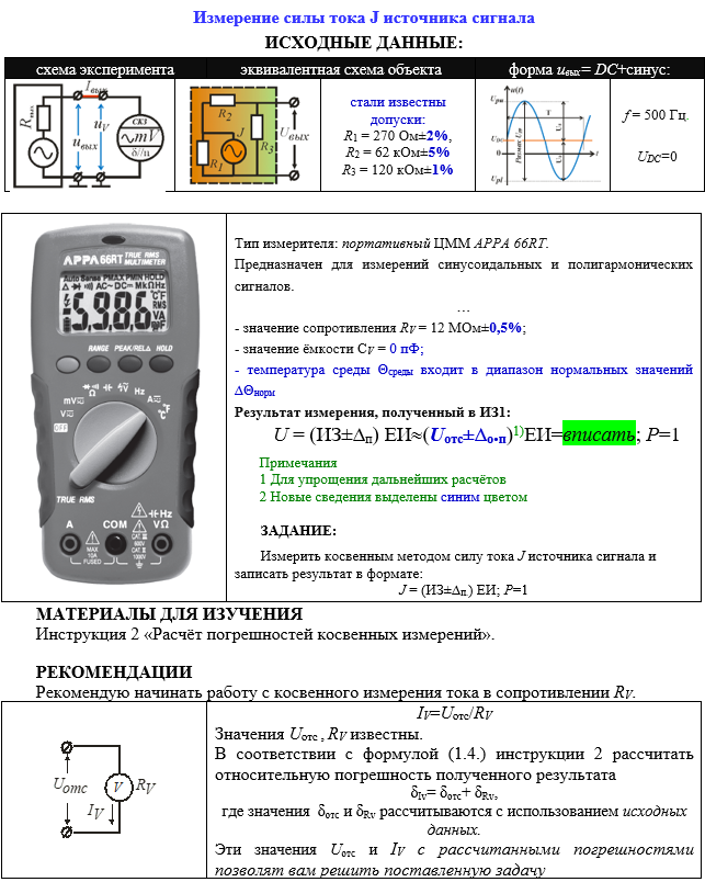 Измерение силы тока J источника сигнала ИСХОДНЫЕ ДАННЫЕ: схема экспериментаэквивалентная схема объектаформа uвых= DC+синус: стали известны допуски: R1 = 270 Ом±2%, R2 = 62 кОм±5% R3 = 120 кОм±1% f = 500 Гц. UDC=0 Тип измерителя: портативный ЦММ APPA 66RT. Предназначен для измерений синусоидальных и полигармонических сигналов. … - значение сопротивления RV = 12 МОм±0,5%; - значение ёмкости СV = 0 пФ; - температура среды Θсреды входит в диапазон нормальных значений ∆Θнорм Результат измерения, полученный в ИЗ1: U = (ИЗ±∆п) ЕИ(Uотс±∆о.п)1)ЕИ=вписать; Р=1 Примечания 1 Для упрощения дальнейших расчётов 2 Новые сведения выделены синим цветом ЗАДАНИЕ: Измерить косвенным методом силу тока J источника сигнала и записать результат в формате: J = (ИЗ±∆п.) ЕИ; Р=1 МАТЕРИАЛЫ ДЛЯ ИЗУЧЕНИЯ Инструкция 2 «Расчёт погрешностей косвенных измерений».