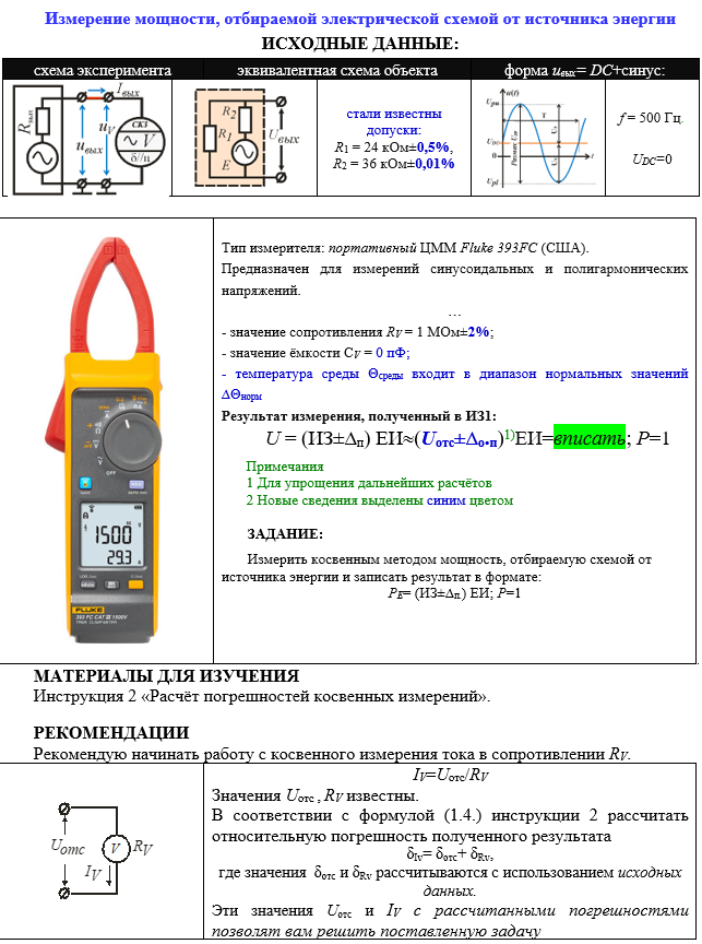 Измерение мощности, отбираемой электрической схемой от источника энергии ИСХОДНЫЕ ДАННЫЕ: схема экспериментаэквивалентная схема объектаформа uвых= DC+синус: стали известны допуски: R1 = 24 кОм±0,5%, R2 = 36 кОм±0,01% f = 500 Гц. UDC=0 Тип измерителя: портативный ЦММ Fluke 393FC (США). Предназначен для измерений синусоидальных и полигармонических напряжений. … - значение сопротивления RV = 1 МОм±2%; - значение ёмкости СV = 0 пФ; - температура среды Θсреды входит в диапазон нормальных значений ∆Θнорм Результат измерения, полученный в ИЗ1: U = (ИЗ±∆п) ЕИ(Uотс±∆о.п)1)ЕИ=вписать; Р=1 Примечания 1 Для упрощения дальнейших расчётов 2 Новые сведения выделены синим цветом ЗАДАНИЕ: Измерить косвенным методом мощность, отбираемую схемой от источника энергии и записать результат в формате: РЕ= (ИЗ±∆п.) ЕИ; Р=1 МАТЕРИАЛЫ ДЛЯ ИЗУЧЕНИЯ Инструкция 2 «Расчёт погрешностей косвенных измерений».