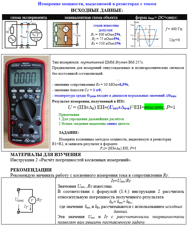 Измерение мощности, выделяемой в резисторах с током ИСХОДНЫЕ ДАННЫЕ: схема экспериментаэквивалентная схема объектаформа uвых= DC+синус: стали известны допуски: R1 = 100 кОм±2%, R2 = 75 кОм±5%, R3 = 510 кОм±1% f = 400 Гц. UDC=0 Тип измерителя: портативный ЦММ Brymen BM 257s. Предназначен для измерений синусоидальных и полигармонических сигналов без постоянной составляющей. … - значение сопротивления RV = 10 МОм±0,5%; - значение ёмкости СV = 0 пФ; - температура среды Θсреды входит в диапазон нормальных значений ∆Θнорм Результат измерения, полученный в ИЗ1: U = (ИЗ±∆п) ЕИ(Uотс±∆о.п)1)ЕИ=вписать; Р=1 Примечания 1 Для упрощения дальнейших расчётов 2 Новые сведения выделены синим цветом ЗАДАНИЕ: Измерить косвенным методом мощность, выделяемую в резисторах R1+R2, и записать результат в формате: Р12= (ИЗ±∆п.) ЕИ; Р=1 МАТЕРИАЛЫ ДЛЯ ИЗУЧЕНИЯ Инструкция 2 «Расчёт погрешностей косвенных измерений».