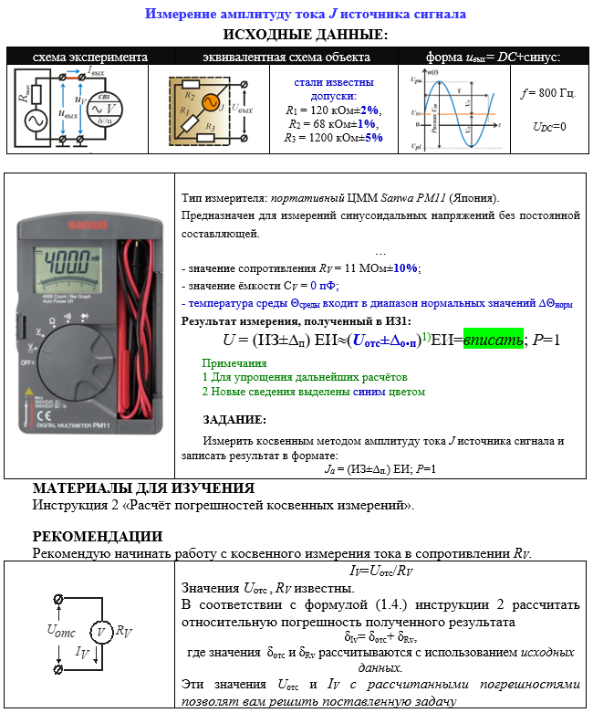 Измерение амплитуду тока J источника сигнала ИСХОДНЫЕ ДАННЫЕ: схема экспериментаэквивалентная схема объектаформа uвых= DC+синус: стали известны допуски: R1 = 120 кОм±2%, R2 = 68 кОм±1%, R3 = 1200 кОм±5% f = 800 Гц. UDC=0 Тип измерителя: портативный ЦММ Sanwa PM11 (Япония). Предназначен для измерений синусоидальных напряжений без постоянной составляющей. … - значение сопротивления RV = 11 МОм±10%; - значение ёмкости СV = 0 пФ; - температура среды Θсреды входит в диапазон нормальных значений ∆Θнорм Результат измерения, полученный в ИЗ1: U = (ИЗ±∆п) ЕИ(Uотс±∆о.п)1)ЕИ=вписать; Р=1 Примечания 1 Для упрощения дальнейших расчётов 2 Новые сведения выделены синим цветом ЗАДАНИЕ: Измерить косвенным методом амплитуду тока J источника сигнала и записать результат в формате: Jа = (ИЗ±∆п.) ЕИ; Р=1 МАТЕРИАЛЫ ДЛЯ ИЗУЧЕНИЯ Инструкция 2 «Расчёт погрешностей косвенных измерений».