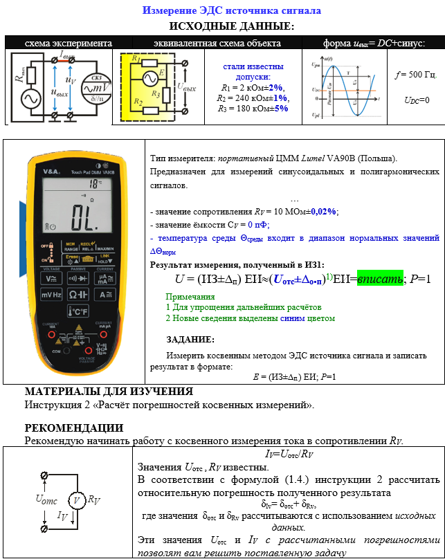 Измерение ЭДС источника сигнала ИСХОДНЫЕ ДАННЫЕ: схема экспериментаэквивалентная схема объектаформа uвых= DC+синус: стали известны допуски: R1 = 2 кОм±2%, R2 = 240 кОм±1%, R3 = 180 кОм±5% f = 500 Гц. UDC=0 Тип измерителя: портативный ЦММ Lumel VA90В (Польша). Предназначен для измерений синусоидальных и полигармонических сигналов. … - значение сопротивления RV = 10 МОм±0,02%; - значение ёмкости СV = 0 пФ; - температура среды Θсреды входит в диапазон нормальных значений ∆Θнорм Результат измерения, полученный в ИЗ1: U = (ИЗ±∆п) ЕИ(Uотс±∆о.п)1)ЕИ=вписать; Р=1 Примечания 1 Для упрощения дальнейших расчётов 2 Новые сведения выделены синим цветом ЗАДАНИЕ: Измерить косвенным методом ЭДС источника сигнала и записать результат в формате: Е = (ИЗ±∆п.) ЕИ; Р=1 МАТЕРИАЛЫ ДЛЯ ИЗУЧЕНИЯ Инструкция 2 «Расчёт погрешностей косвенных измерений».