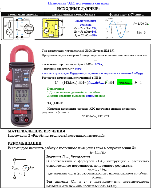 Измерение ЭДС источника сигнала ИСХОДНЫЕ ДАННЫЕ: схема экспериментаэквивалентная схема объектаформа uвых= DC+синус: стали известны допуски: R1 = 27 кОм±2%, R2 = 56 кОм±1%, R3 = 62 кОм±5% f = 1500 Гц. UDC=0 Тип измерителя: портативный ЦММ Brymen BM 357. Предназначен для измерений синусоидальных и полигармонических сигналов. … - значение сопротивления RV = 2 МОм±0,2%; - значение ёмкости СV = 0 пФ; - температура среды Θсреды входит в диапазон нормальных значений ∆Θнорм Результат измерения, полученный в ИЗ1: U = (ИЗ±∆п) ЕИ(Uотс±∆о.п)1)ЕИ=вписать; Р=1 Примечания 1 Для упрощения дальнейших расчётов 2 Новые сведения выделены синим цветом ЗАДАНИЕ: Измерить косвенным методом ЭДС источника сигнала и записать результат в формате: Е= (ИЗ±∆п.) ЕИ; Р=1 МАТЕРИАЛЫ ДЛЯ ИЗУЧЕНИЯ Инструкция 2 «Расчёт погрешностей косвенных измерений».
