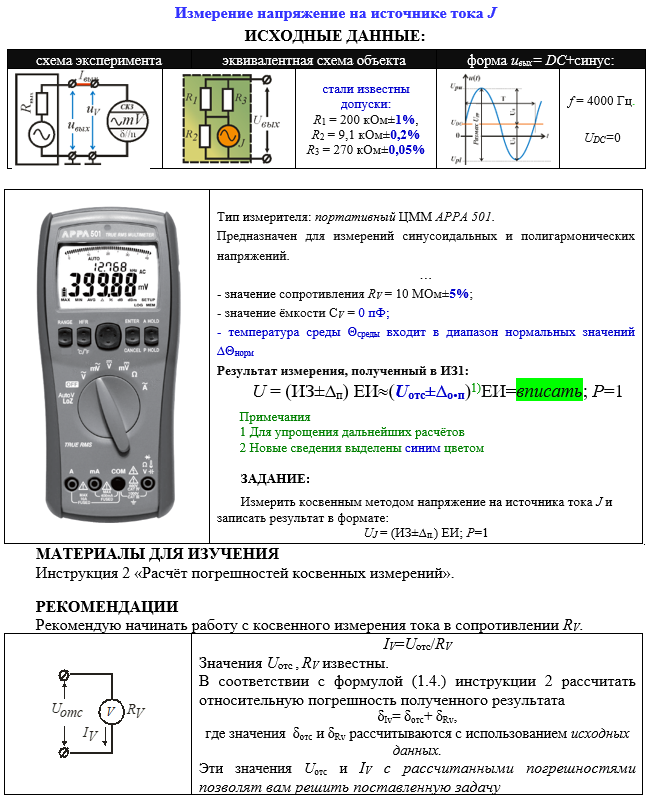 Измерение напряжение на источнике тока J ИСХОДНЫЕ ДАННЫЕ: схема экспериментаэквивалентная схема объектаформа uвых= DC+синус: стали известны допуски: R1 = 200 кОм±1%, R2 = 9,1 кОм±0,2% R3 = 270 кОм±0,05% f = 4000 Гц. UDC=0 Тип измерителя: портативный ЦММ APPA 501. Предназначен для измерений синусоидальных и полигармонических напряжений. … - значение сопротивления RV = 10 МОм±5%; - значение ёмкости СV = 0 пФ; - температура среды Θсреды входит в диапазон нормальных значений ∆Θнорм Результат измерения, полученный в ИЗ1: U = (ИЗ±∆п) ЕИ(Uотс±∆о.п)1)ЕИ=вписать; Р=1 Примечания 1 Для упрощения дальнейших расчётов 2 Новые сведения выделены синим цветом ЗАДАНИЕ: Измерить косвенным методом напряжение на источника тока J и записать результат в формате: UJ = (ИЗ±∆п.) ЕИ; Р=1 МАТЕРИАЛЫ ДЛЯ ИЗУЧЕНИЯ Инструкция 2 «Расчёт погрешностей косвенных измерений».