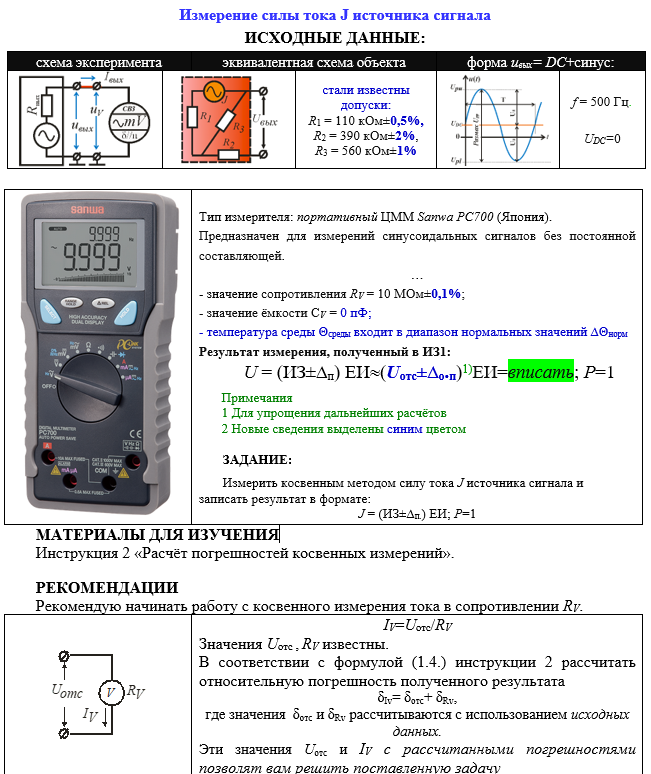 Измерение силы тока J источника сигнала ИСХОДНЫЕ ДАННЫЕ: схема экспериментаэквивалентная схема объектаформа uвых= DC+синус: стали известны допуски: R1 = 110 кОм±0,5%, R2 = 390 кОм±2%, R3 = 560 кОм±1% f = 500 Гц. UDC=0 Тип измерителя: портативный ЦММ Sanwa PC700 (Япония). Предназначен для измерений синусоидальных сигналов без постоянной составляющей. … - значение сопротивления RV = 10 МОм±0,1%; - значение ёмкости СV = 0 пФ; - температура среды Θсреды входит в диапазон нормальных значений ∆Θнорм Результат измерения, полученный в ИЗ1: U = (ИЗ±∆п) ЕИ(Uотс±∆о.п)1)ЕИ=вписать; Р=1 Примечания 1 Для упрощения дальнейших расчётов 2 Новые сведения выделены синим цветом ЗАДАНИЕ: Измерить косвенным методом силу тока J источника сигнала и записать результат в формате: J = (ИЗ±∆п.) ЕИ; Р=1 МАТЕРИАЛЫ ДЛЯ ИЗУЧЕНИЯ Инструкция 2 «Расчёт погрешностей косвенных измерений».