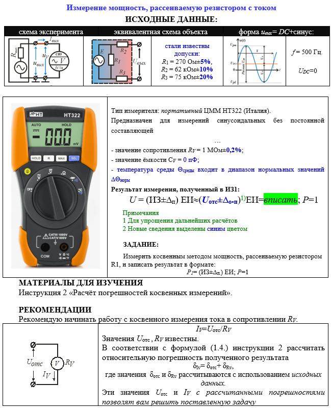 Измерение мощность, рассеиваемую резистором с током ИСХОДНЫЕ ДАННЫЕ: схема экспериментаэквивалентная схема объектаформа uвых= DC+синус: стали известны допуски: R1 = 270 Ом±5%, R2 = 62 кОм±10% R3 = 75 кОм±20% f = 500 Гц. UDC=0 Тип измерителя: портативный ЦММ HT322 (Италия). Предназначен для измерений синусоидальных без постоянной составляющей … - значение сопротивления RV = 1 МОм±0,2%; - значение ёмкости СV = 0 пФ; - температура среды Θсреды входит в диапазон нормальных значений ∆Θнорм Результат измерения, полученный в ИЗ1: U = (ИЗ±∆п) ЕИ(Uотс±∆о.п)1)ЕИ=вписать; Р=1 Примечания 1 Для упрощения дальнейших расчётов 2 Новые сведения выделены синим цветом ЗАДАНИЕ: Измерить косвенным методом мощность, рассеиваемую резистором R1, и записать результат в формате: Р1= (ИЗ±∆п.) ЕИ; Р=1 МАТЕРИАЛЫ ДЛЯ ИЗУЧЕНИЯ Инструкция 2 «Расчёт погрешностей косвенных измерений».