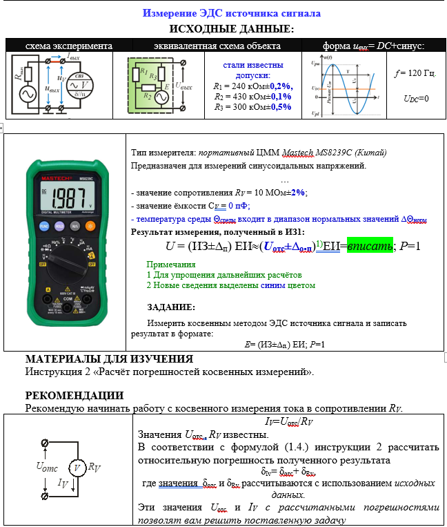 Измерение ЭДС источника сигнала ИСХОДНЫЕ ДАННЫЕ: схема экспериментаэквивалентная схема объектаформа uвых= DC+синус: стали известны допуски: R1 = 240 кОм±0,2%, R2 = 430 кОм±0,1% R3 = 300 кОм±0,5% f = 120 Гц. UDC=0 Тип измерителя: портативный ЦММ Mastech MS8239C (Китай) Предназначен для измерений синусоидальных напряжений. … - значение сопротивления RV = 10 МОм±2%; - значение ёмкости СV = 0 пФ; - температура среды Θсреды входит в диапазон нормальных значений ∆Θнорм Результат измерения, полученный в ИЗ1: U = (ИЗ±∆п) ЕИ(Uотс±∆о.п)1)ЕИ=вписать; Р=1 Примечания 1 Для упрощения дальнейших расчётов 2 Новые сведения выделены синим цветом ЗАДАНИЕ: Измерить косвенным методом ЭДС источника сигнала и записать результат в формате: Е= (ИЗ±∆п.) ЕИ; Р=1 МАТЕРИАЛЫ ДЛЯ ИЗУЧЕНИЯ Инструкция 2 «Расчёт погрешностей косвенных измерений».