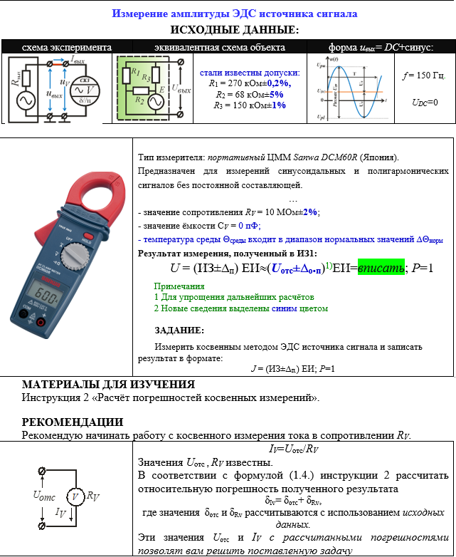 Измерение амплитуды ЭДС источника сигнала ИСХОДНЫЕ ДАННЫЕ: схема экспериментаэквивалентная схема объектаформа uвых= DC+синус: стали известны допуски: R1 = 270 кОм±0,2%, R2 = 68 кОм±5% R3 = 150 кОм±1% f = 150 Гц. UDC=0 Тип измерителя: портативный ЦММ Sanwa DCM60R (Япония). Предназначен для измерений синусоидальных и полигармонических сигналов без постоянной составляющей. … - значение сопротивления RV = 10 МОм±2%; - значение ёмкости СV = 0 пФ; - температура среды Θсреды входит в диапазон нормальных значений ∆Θнорм Результат измерения, полученный в ИЗ1: U = (ИЗ±∆п) ЕИ(Uотс±∆о.п)1)ЕИ=вписать; Р=1 Примечания 1 Для упрощения дальнейших расчётов 2 Новые сведения выделены синим цветом ЗАДАНИЕ: Измерить косвенным методом ЭДС источника сигнала и записать результат в формате: J = (ИЗ±∆п.) ЕИ; Р=1 МАТЕРИАЛЫ ДЛЯ ИЗУЧЕНИЯ Инструкция 2 «Расчёт погрешностей косвенных измерений».