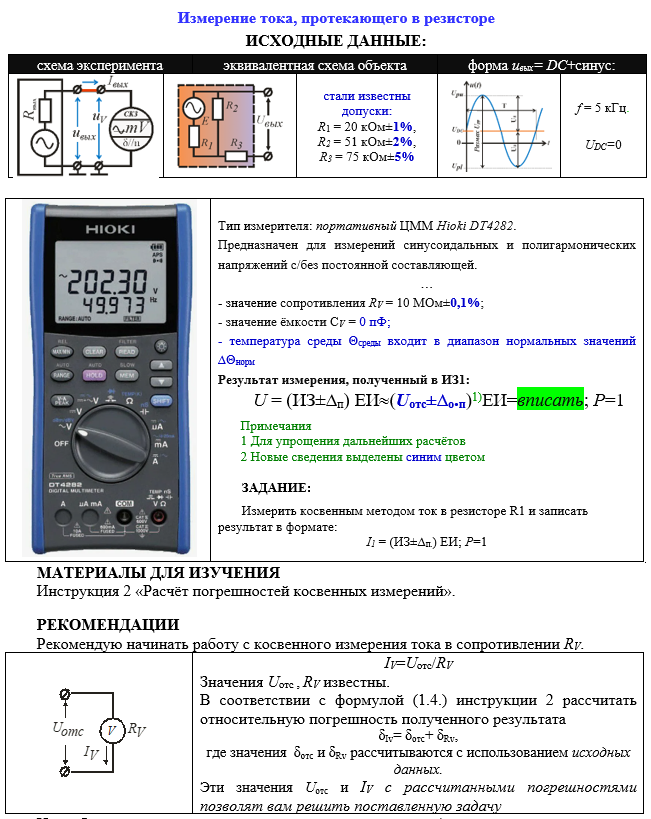 Измерение тока, протекающего в резисторе ИСХОДНЫЕ ДАННЫЕ: схема экспериментаэквивалентная схема объектаформа uвых= DC+синус: стали известны допуски: R1 = 20 кОм±1%, R2 = 51 кОм±2%, R3 = 75 кОм±5% f = 5 кГц. UDC=0 Тип измерителя: портативный ЦММ Hioki DT4282. Предназначен для измерений синусоидальных и полигармонических напряжений с/без постоянной составляющей. … - значение сопротивления RV = 10 МОм±0,1%; - значение ёмкости СV = 0 пФ; - температура среды Θсреды входит в диапазон нормальных значений ∆Θнорм Результат измерения, полученный в ИЗ1: U = (ИЗ±∆п) ЕИ(Uотс±∆о.п)1)ЕИ=вписать; Р=1 Примечания 1 Для упрощения дальнейших расчётов 2 Новые сведения выделены синим цветом ЗАДАНИЕ: Измерить косвенным методом ток в резисторе R1 и записать результат в формате: I1 = (ИЗ±∆п.) ЕИ; Р=1 МАТЕРИАЛЫ ДЛЯ ИЗУЧЕНИЯ Инструкция 2 «Расчёт погрешностей косвенных измерений».