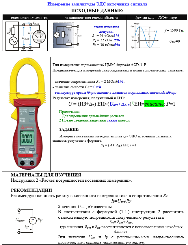 Измерение амплитуды ЭДС источника сигнала ИСХОДНЫЕ ДАННЫЕ: схема экспериментаэквивалентная схема объектаформа uвых= DC+синус: стали известны допуски: R1 = 91 кОм±1%, R2 = 22 кОм±2% R3 = 30 кОм±5% f = 1500 Гц. UDC=0 Тип измерителя: портативный ЦММ Amprobe ACD-31P. Предназначен для измерений синусоидальных и полигармонических сигналов. … - значение сопротивления RV = 2 МОм±1%; - значение ёмкости СV = 0 пФ; - температура среды Θсреды входит в диапазон нормальных значений ∆Θнорм Результат измерения, полученный в ИЗ1: U = (ИЗ±∆п) ЕИ(Uотс±∆о.п)1)ЕИ=вписать; Р=1 Примечания 1 Для упрощения дальнейших расчётов 2 Новые сведения выделены синим цветом ЗАДАНИЕ: Измерить косвенным методом амплитуду ЭДС источника сигнала и записать результат в формате: Еа = (ИЗ±∆п.) ЕИ; Р=1 МАТЕРИАЛЫ ДЛЯ ИЗУЧЕНИЯ Инструкция 2 «Расчёт погрешностей косвенных измерений».