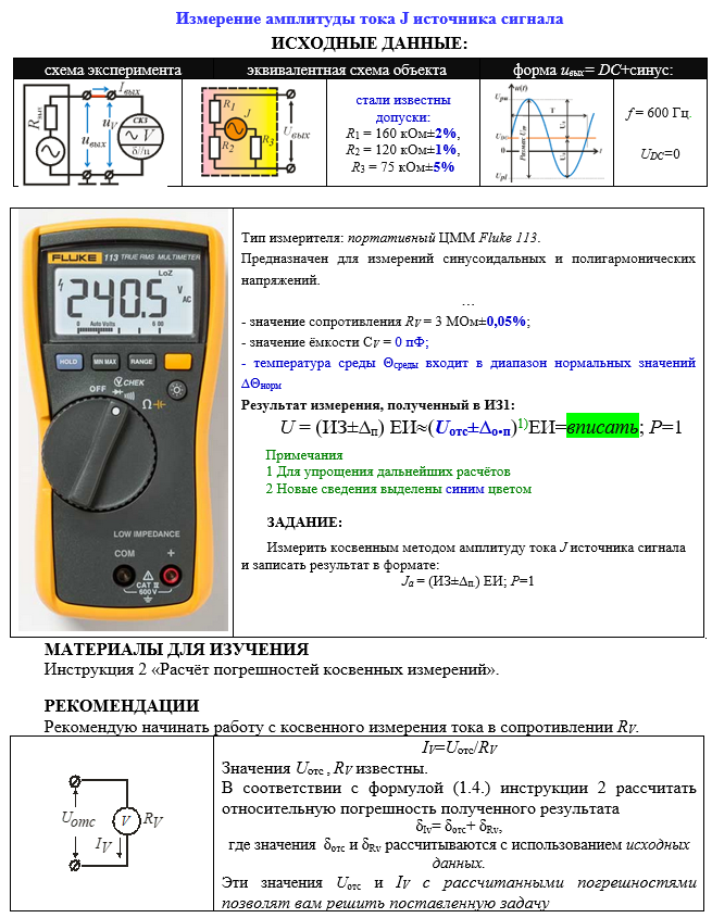 Измерение амплитуды тока J источника сигнала ИСХОДНЫЕ ДАННЫЕ: схема экспериментаэквивалентная схема объектаформа uвых= DC+синус: стали известны допуски: R1 = 160 кОм±2%, R2 = 120 кОм±1%, R3 = 75 кОм±5% f = 600 Гц. UDC=0 Тип измерителя: портативный ЦММ Fluke 113. Предназначен для измерений синусоидальных и полигармонических напряжений. … - значение сопротивления RV = 3 МОм±0,05%; - значение ёмкости СV = 0 пФ; - температура среды Θсреды входит в диапазон нормальных значений ∆Θнорм Результат измерения, полученный в ИЗ1: U = (ИЗ±∆п) ЕИ(Uотс±∆о.п)1)ЕИ=вписать; Р=1 Примечания 1 Для упрощения дальнейших расчётов 2 Новые сведения выделены синим цветом ЗАДАНИЕ: Измерить косвенным методом амплитуду тока J источника сигнала и записать результат в формате: Jа = (ИЗ±∆п.) ЕИ; Р=1 МАТЕРИАЛЫ ДЛЯ ИЗУЧЕНИЯ Инструкция 2 «Расчёт погрешностей косвенных измерений».