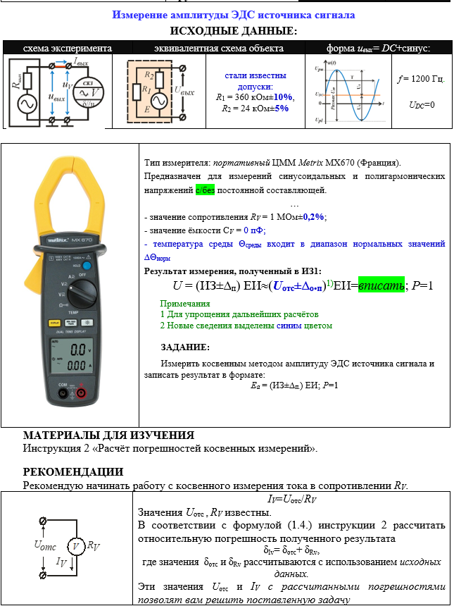 Измерение амплитуды ЭДС источника сигнала ИСХОДНЫЕ ДАННЫЕ: схема экспериментаэквивалентная схема объектаформа uвых= DC+синус: стали известны допуски: R1 = 360 кОм±10%, R2 = 24 кОм±5% f = 1200 Гц. UDC=0 Тип измерителя: портативный ЦММ Metrix MX670 (Франция). Предназначен для измерений синусоидальных и полигармонических напряжений c/без постоянной составляющей. … - значение сопротивления RV = 1 МОм±0,2%; - значение ёмкости СV = 0 пФ; - температура среды Θсреды входит в диапазон нормальных значений ∆Θнорм Результат измерения, полученный в ИЗ1: U = (ИЗ±∆п) ЕИ(Uотс±∆о.п)1)ЕИ=вписать; Р=1 Примечания 1 Для упрощения дальнейших расчётов 2 Новые сведения выделены синим цветом ЗАДАНИЕ: Измерить косвенным методом амплитуду ЭДС источника сигнала и записать результат в формате: Еа = (ИЗ±∆п.) ЕИ; Р=1 МАТЕРИАЛЫ ДЛЯ ИЗУЧЕНИЯ Инструкция 2 «Расчёт погрешностей косвенных измерений».