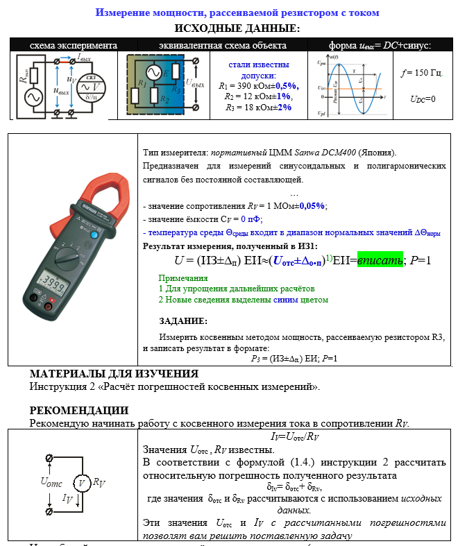 Измерение мощности, рассеиваемой резистором с током ИСХОДНЫЕ ДАННЫЕ: схема экспериментаэквивалентная схема объектаформа uвых= DC+синус: стали известны допуски: R1 = 390 кОм±0,5%, R2 = 12 кОм±1%, R3 = 18 кОм±2% f = 150 Гц. UDC=0 Тип измерителя: портативный ЦММ Sanwa DCM400 (Япония). Предназначен для измерений синусоидальных и полигармонических сигналов без постоянной составляющей. … - значение сопротивления RV = 1 МОм±0,05%; - значение ёмкости СV = 0 пФ; - температура среды Θсреды входит в диапазон нормальных значений ∆Θнорм Результат измерения, полученный в ИЗ1: U = (ИЗ±∆п) ЕИ(Uотс±∆о.п)1)ЕИ=вписать; Р=1 Примечания 1 Для упрощения дальнейших расчётов 2 Новые сведения выделены синим цветом ЗАДАНИЕ: Измерить косвенным методом мощность, рассеиваемую резистором R3, и записать результат в формате: Р3 = (ИЗ±∆п.) ЕИ; Р=1 МАТЕРИАЛЫ ДЛЯ ИЗУЧЕНИЯ Инструкция 2 «Расчёт погрешностей косвенных измерений».
