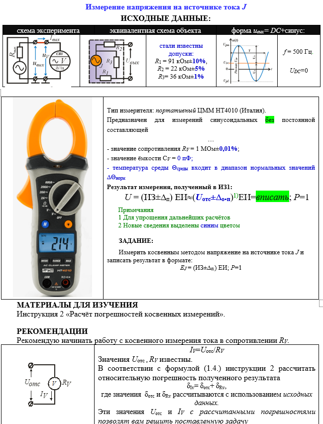 Измерение напряжения на источнике тока J ИСХОДНЫЕ ДАННЫЕ: схема экспериментаэквивалентная схема объектаформа uвых= DC+синус: стали известны допуски: R1 = 91 кОм±10%, R2 = 22 кОм±5% R3= 36 кОм±1% f = 500 Гц. UDC=0 Тип измерителя: портативный ЦММ HT4010 (Италия). Предназначен для измерений синусоидальных без постоянной составляющей … - значение сопротивления RV = 1 МОм±0,01%; - значение ёмкости СV = 0 пФ; - температура среды Θсреды входит в диапазон нормальных значений ∆Θнорм Результат измерения, полученный в ИЗ1: U = (ИЗ±∆п) ЕИ(Uотс±∆о.п)1)ЕИ=вписать; Р=1 Примечания 1 Для упрощения дальнейших расчётов 2 Новые сведения выделены синим цветом ЗАДАНИЕ: Измерить косвенным методом напряжение на источнике тока J и записать результат в формате: ЕJ = (ИЗ±∆п.) ЕИ; Р=1 МАТЕРИАЛЫ ДЛЯ ИЗУЧЕНИЯ Инструкция 2 «Расчёт погрешностей косвенных измерений».